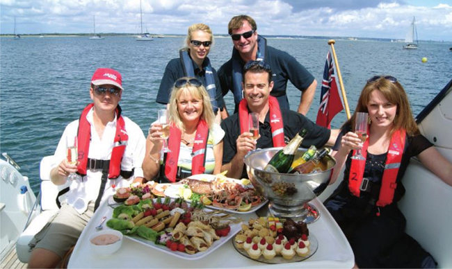 “For our lunch we spent a delightful hour or so touring the stunning Jurassic coastline before reaching our destination of Harry’s Rocks, where we dropped anchor and were served champagne while basking in the sun, the sea gently lapping at the sides of the boat: a seafood platter of fresh Dorset lobster, crab, langoustines and king prawns. Another platter was filled with Italian cuts, Scottish smoked salmon and retro prawn-filled avocados marie rose, and wild mushrooms, Dorset goat’s cheese and pesto tartlets, wild rocket and sun-blushed tomatoes. This was followed by a platter of desserts: chocolate fudge brownies, melon kebabs, raspberry and cream tartlets and miniture scones with jam and scones.”
