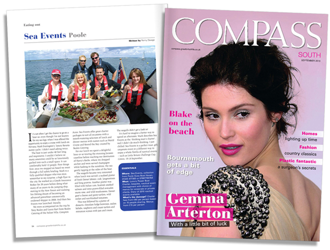There is a nice article about Sea Events in the September issue of Compass South. Penny Davage writes “It’s not often I get the chance to go on a boat so, even though I’m not known for my sea legs, when I was offered the opportunity to cruise with lunch on Nirvana, Mark Everington’s luxury Bavaria motor yacht, I didn’t need asking twice. The boat is just under 40 feet long, and impressive; I couldn’t believe so many amenities could be so luxuriously packed into such a small space. It can comfortable hold 12 people.”